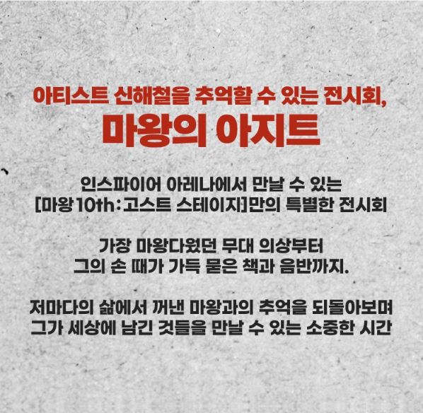 콘서트와 더불어 특별 전시회 '마왕의 아지트'가 함께 진행됩니다. 이 전시회는 아티스트 신해철을 추억하는 공간으로 마련되었습니다.