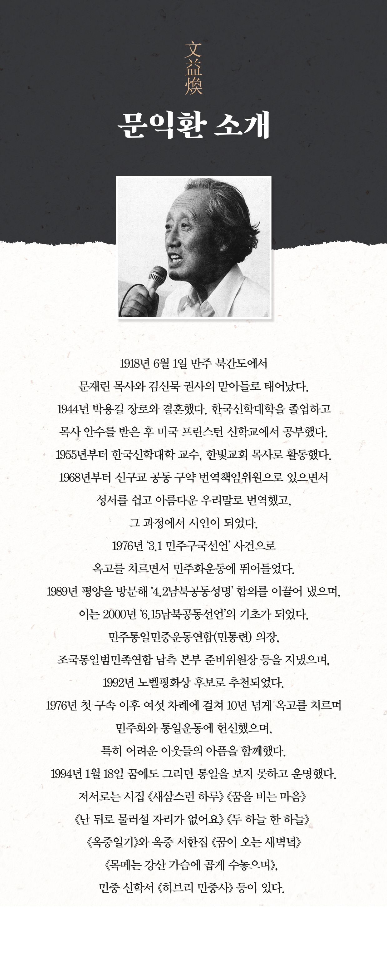 문익환 목사는 1918년 평안남도 평원군에서 태어나 일제강점기와 한국전쟁, 그리고 분단의 아픔을 몸소 겪었습니다. 그는 신학자이자 목사로서, 또한 시인이자 사회운동가로서 다양한 면모를 보여주었습니다. 특히 그의 통일 운동은 한국 사회에 큰 반향을 일으켰습니다.
