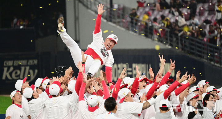 우승 후 선수들을 모두 안아주는 KIA 이범호 감독의 모습은 팀의 단결력과 감독의 리더십을 잘 보여주는 장면이었습니다.
