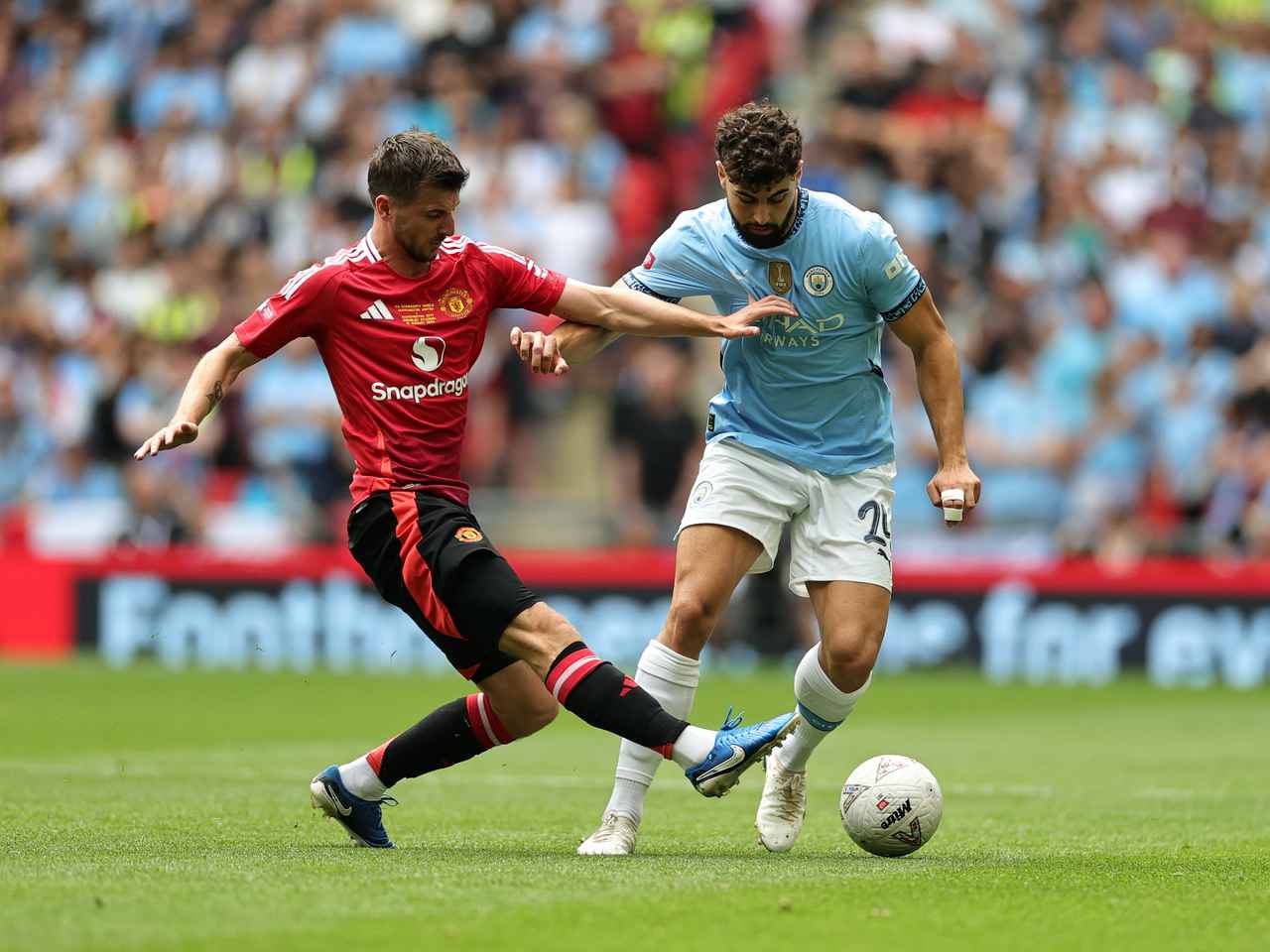 경기는 영국 런던의 웸블리 스타디움에서 열렸으며, 양 팀은 1-1로 비긴 후 승부차기로 접전을 벌였습니다. 전반전은 양 팀 모두 득점 없이 종료되었고, 후반 37분 맨유의 알레한드로 가르나초가 선제골을 기록하며 리드를 잡았습니다. 그러나 후반 44분 맨시티의 베르나르두 실바가 동점골을 넣으며 경기는 승부차기로 이어졌습니다.