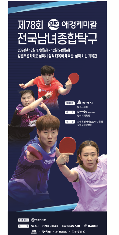한국 탁구의 최강자를 가리는 제78회 전국남녀종합탁구선수권대회가 2024년 12월 17일부터 24일까지 강원도 삼척 다목적체육관에서 개최됩니다. 국내 최고 권위의 탁구 대회로 꼽히는 이번 대회는 초·중·고등학생부터 일반부와 국가대표 선수들까지 모든 연령대와 계층의 선수가 참가해 실력을 겨룹니다.