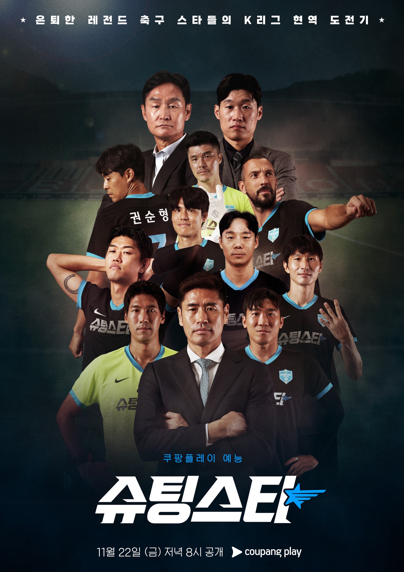 '슈팅스타'는 박지성 단장과 최용수 감독이 이끄는 'FC 슈팅스타'의 창단과 도전을 그린 예능 프로그램입니다. 2024년 11월 22일부터 매주 금요일 저녁 8시에 쿠팡플레이를 통해 공개되고 있습니다.