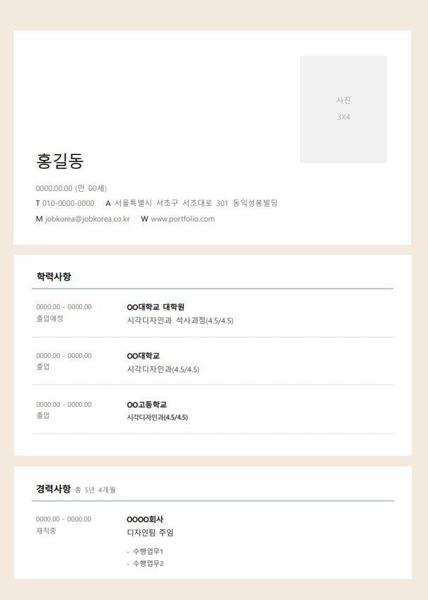 - 잡코리아, 사람인 등 취업 포털 사이트는 취업 준비생들에게 최적화된 다양한 이력서 양식을 제공합니다.