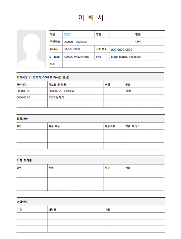 - 고용노동부 등 정부 및 공공기관에서도 표준 이력서 양식을 제공합니다.