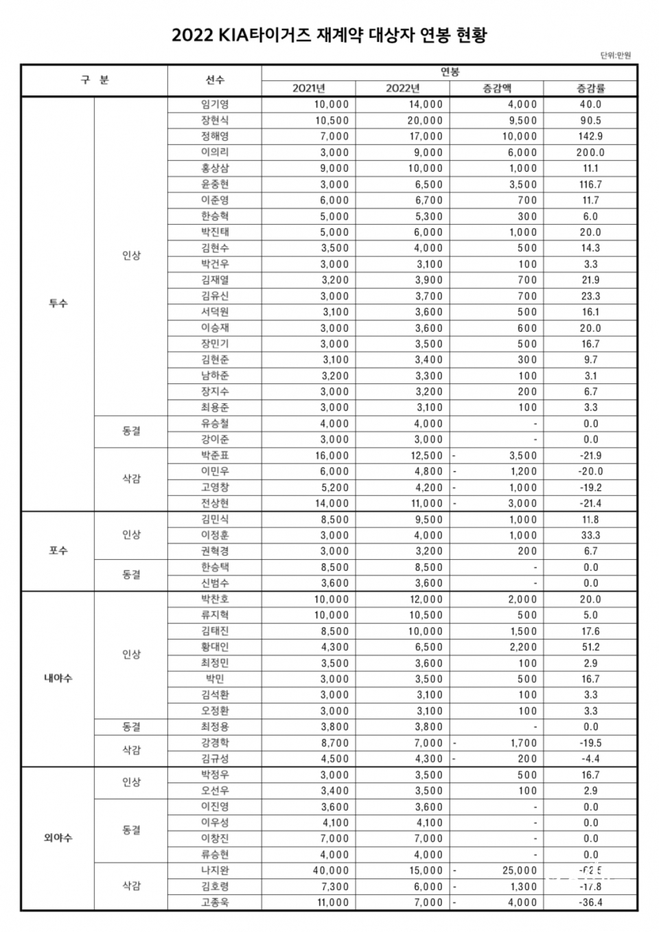 기타 선수들의 연봉 계약 현황