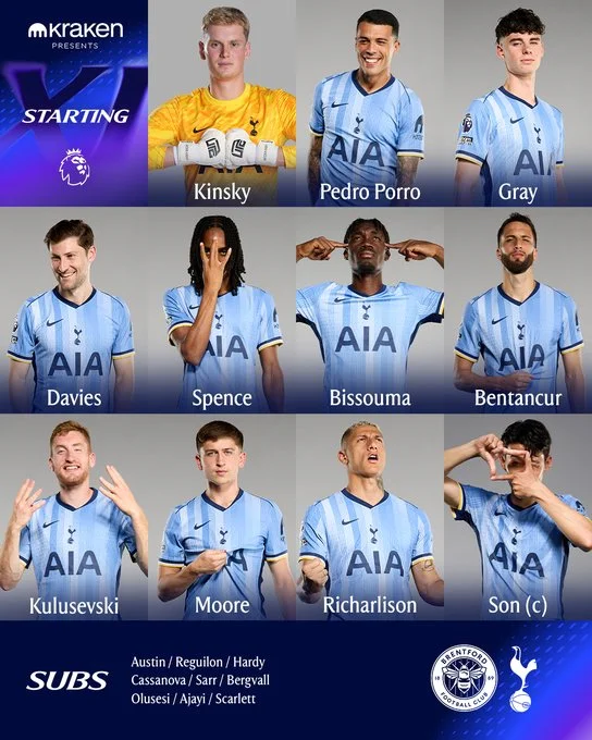 엔제 포스테코글루 감독이 이끄는 토트넘은 이날 4-3-3 포메이션을 가동했습니다. 안토닌 킨스키가 골문을 지켰고, 제드 스펜스, 벤 데이비스, 아치 그레이, 페드로 포로가 백4를 구축했습니다. 중원에는 이브 비수마, 로드리고 벤탄쿠르, 데얀 쿨루셉스키가 포진했고, 전방 스리톱에는 손흥민, 히샬리송, 마이키 무어가 나섰습니다.