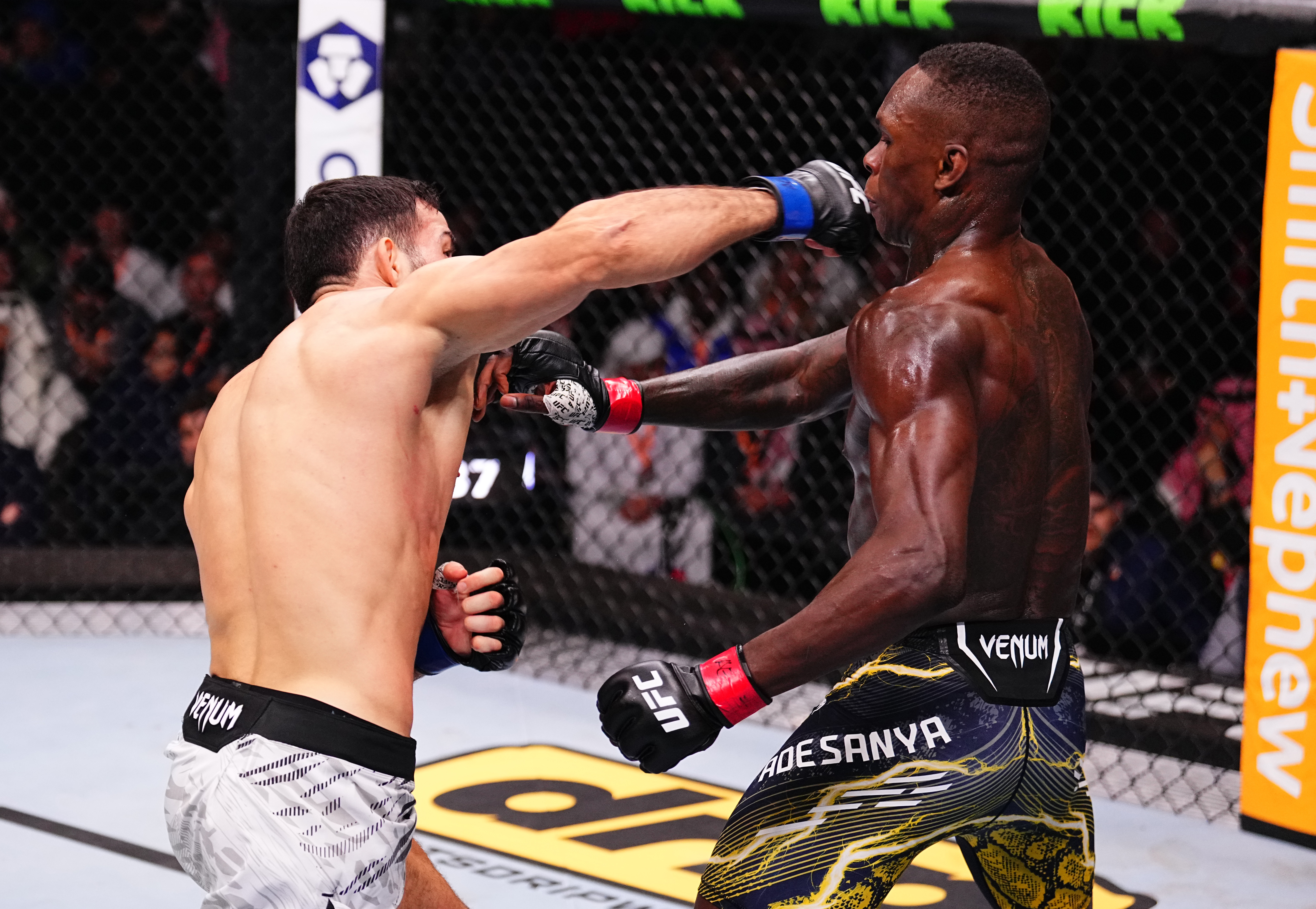 이번 이마보프와의 경기에서 아데산야는 1라운드에서 좋은 모습을 보였습니다. 잽과 카프킥을 효과적으로 사용하며 타격전에서 우위를 점했고, 이마보프의 테이크다운 시도도 모두 막아냈습니다.