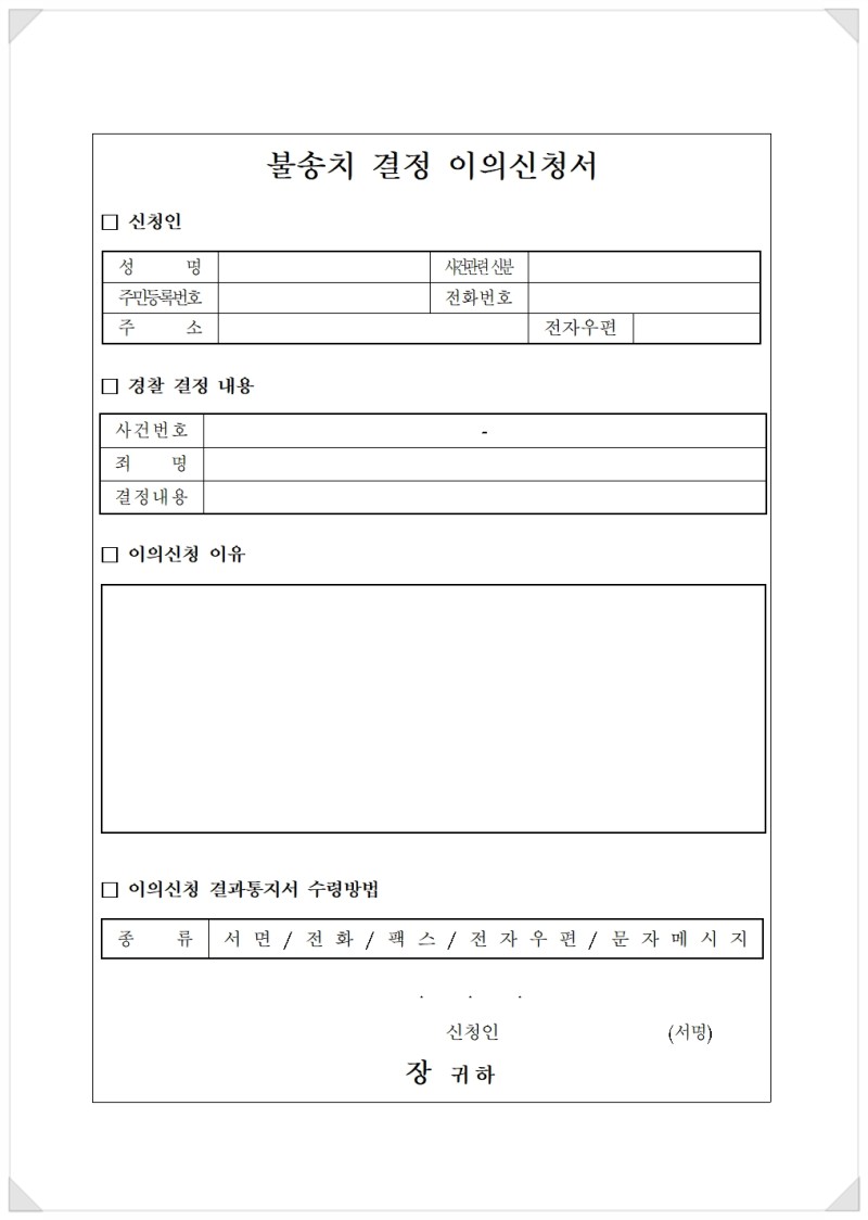 불송치 결정 이의신청서 양식 아래 파일 다운받아 사용하세요.