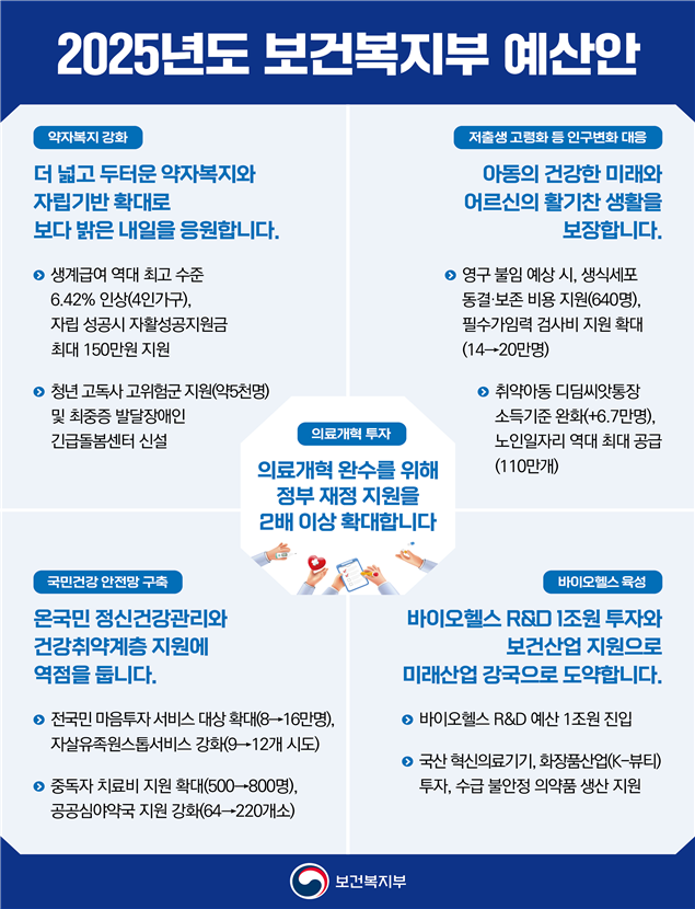 이러한 기조에 따라 2025년 예산안은 사회적 약자에 대한 맞춤형 지원과 저출생 대응에 초점을 맞추고 있습니다. 또한, 국민의 삶의 질 향상과 국가 경쟁력 강화를 위한 다양한 사업들이 포함되어 있습니다.