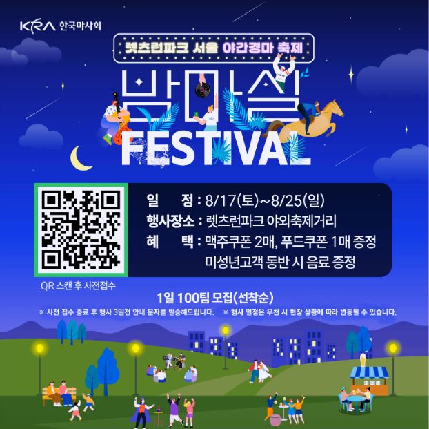 밤마실 페스티벌은 무료로 입장할 수 있으며, 렛츠런파크 서울 공식 블로그를 통해 무료입장권을 신청할 수 있습니다. 이 외에도 푸드존에서는 다양한 먹거리를 즐길 수 있으며, 오락기 체험존과 초보경마 퀴즈존 등 가족들이 함께 즐길 수 있는 체험 활동도 마련되어 있습니다.